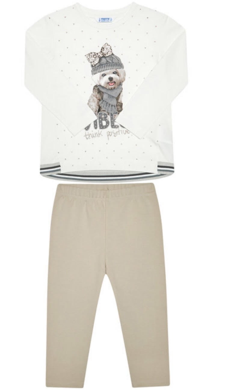 Legínový teplejší set s béžovými legínami a mikinou s dlhým rukávom. Mikina s potlačou obrázka psíka. Materiál: 98% balvna, 2% elastan.