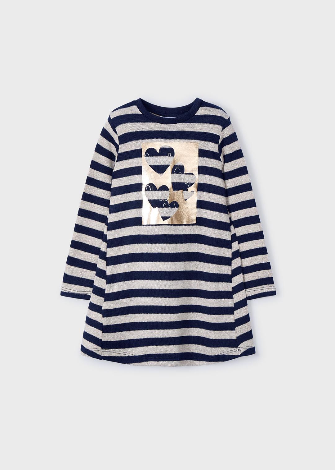 Dievčenské pletené pruhované šaty s motívom srdiečok. Šaty s dlhým rukávom.