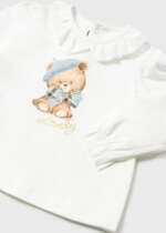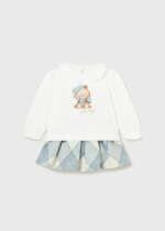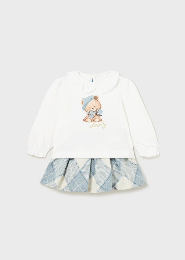 Sukňový set s tričkom s dlhým rukávom. Károvaná sukňa v svetlomodrej farbe so zipsom a s gumou na páse. Biele tričko s dlhým rukávom s potlačou medvedíka a volánom na golieri. Rukávy sú ukončené gumičkou s volánikom. Tričko má vzadu pri krku dva cvoky pre jednoduchšie obliekanie. Materiál: sukňa 38% polyester, 35% akryl, 15% bavlna, 10% vlna, 2% iné materiály, podšívka 100% bavlna, tričko 96% bavlna, 4% elastan.
