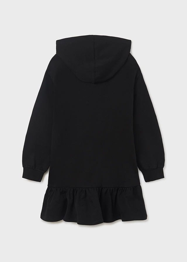 ECOFRIENDS fleece dress black garment 100% sustainable cotton. Long sleeved dress for girl. Hooded design. Design with decorative ruffles at the bottom of the item.