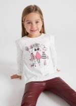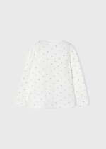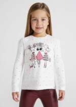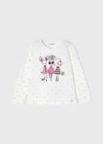 MAYORAL dievčenské tričko s dlhým rukávom bielej farby. Vzor bodiek a postavičiek. Materiál: 95% bavlna, 5% elastan.