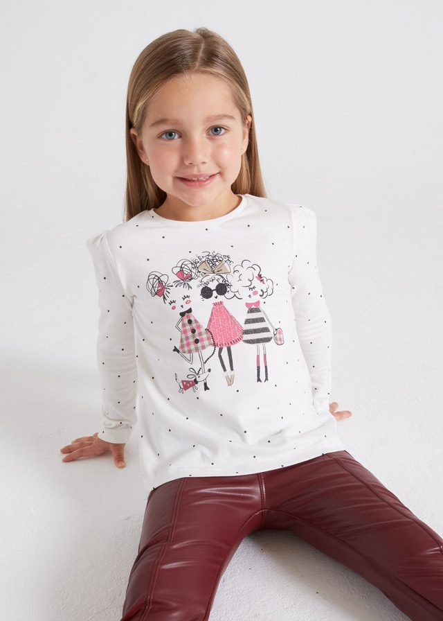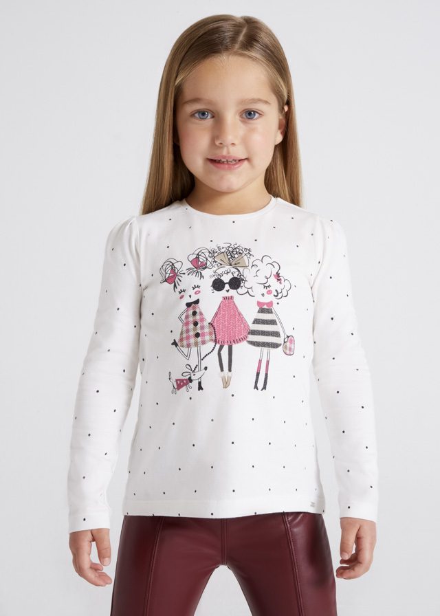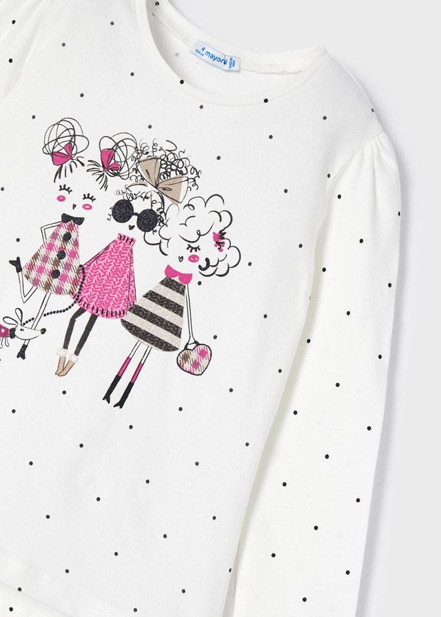 T-shirt with long sleeves for girls of white color and with a characters print and dots. Round neckline.