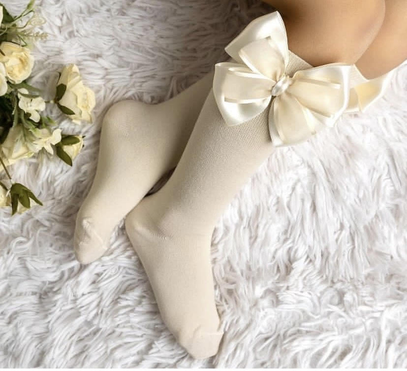 Krásne podkolienky maslovej farby s veľkou dvojitou mašľou