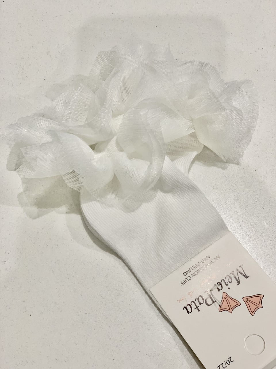 Krásne podkolienky bielej farby ozdobené nariaseným tylovým volánom. Materiál: 80% bavlna, 17% polyamid, 3% elastan.