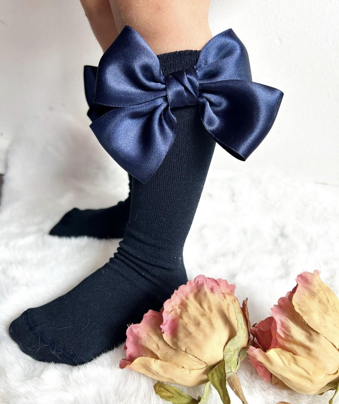Kneesocks with double satin bow navy blue. These blue knee high socks feature a large satin bow on the side. Perfect for any occasion!