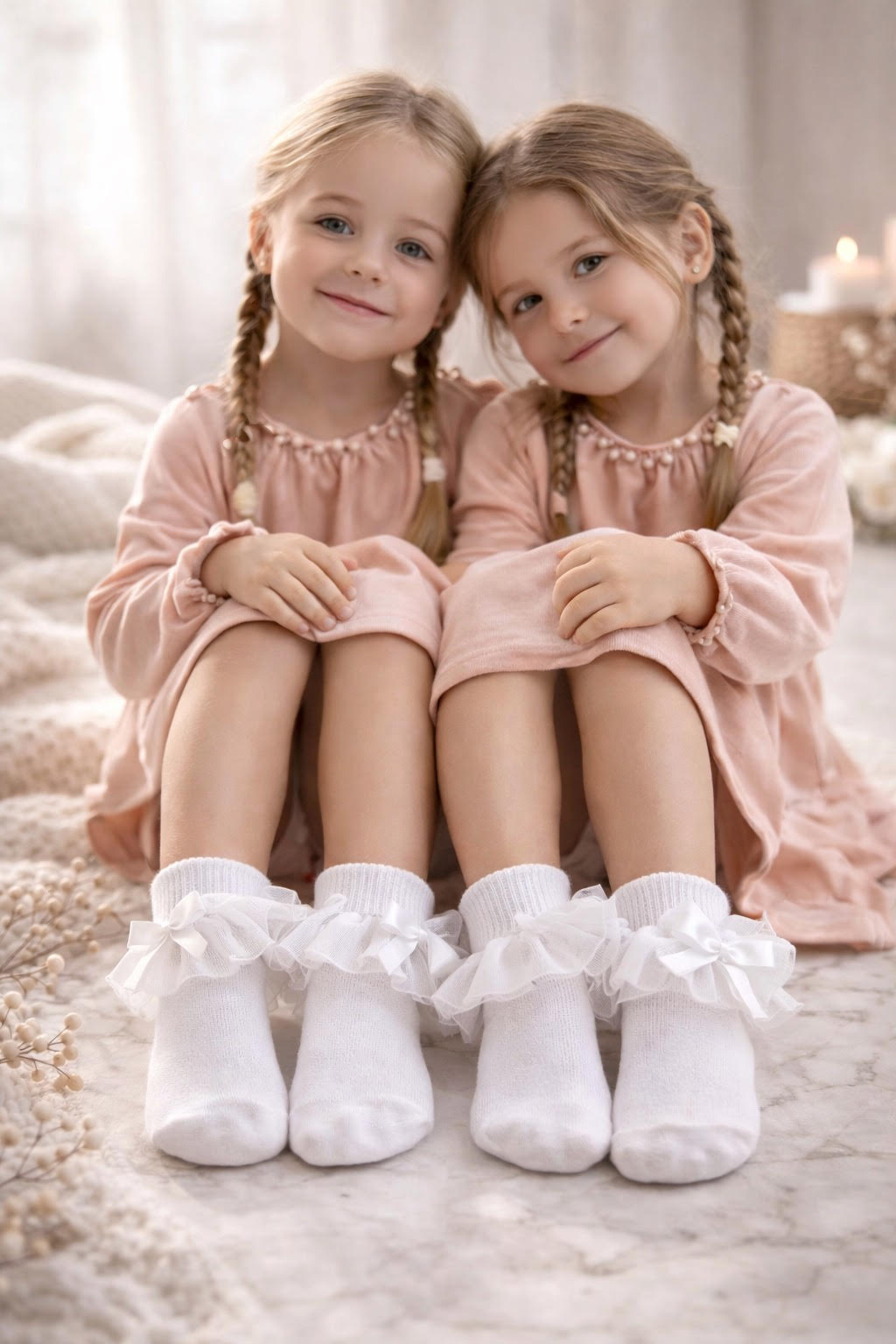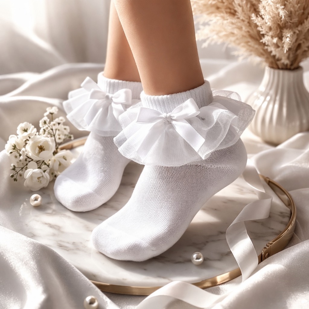 Biele ponožky s nariaseným tylovým volánom a saténovou mašličkou. Kvalitné ponožky portugalskej značky, ktoré využiteje najmä na svadby, oslavy a fotenia.