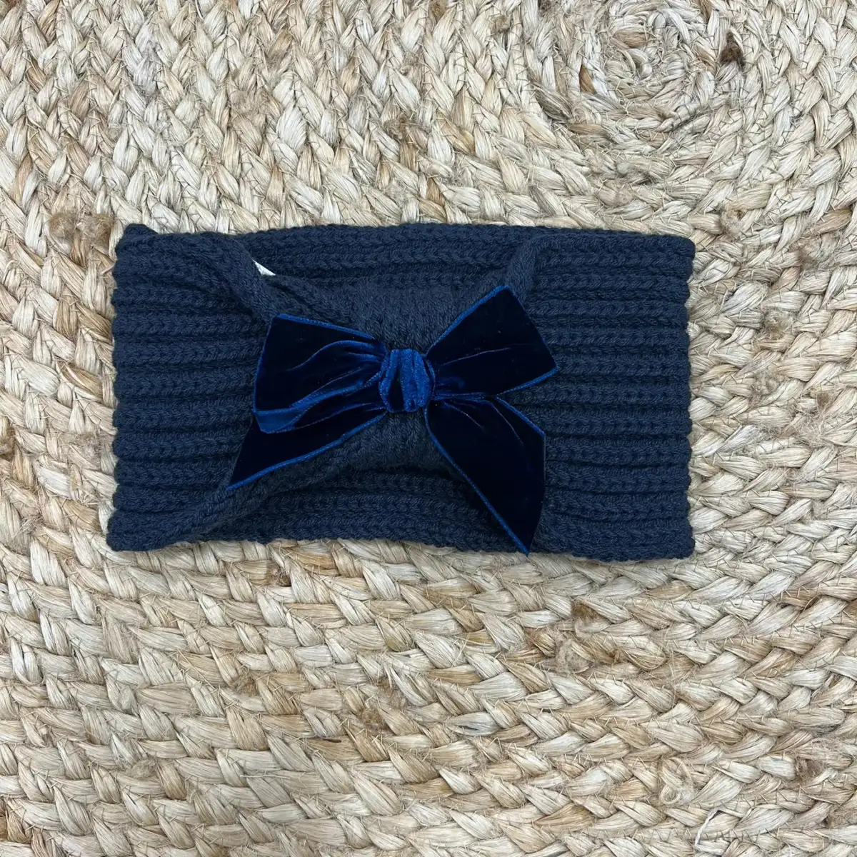 Tmavomodrá pletená čelenka s velvet mašľou.