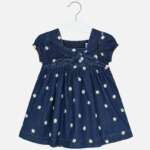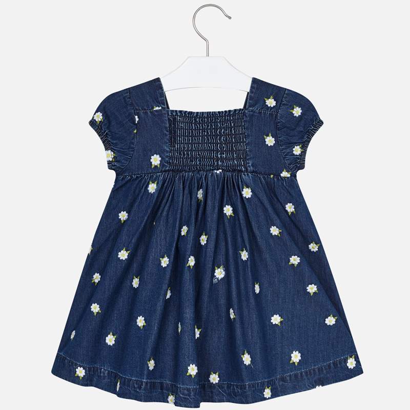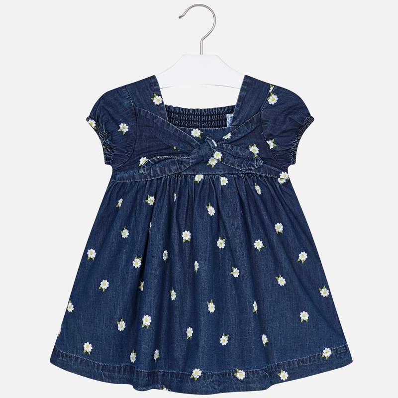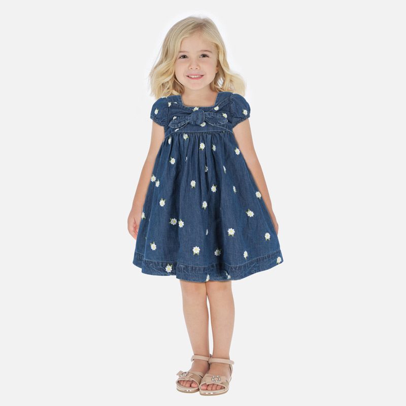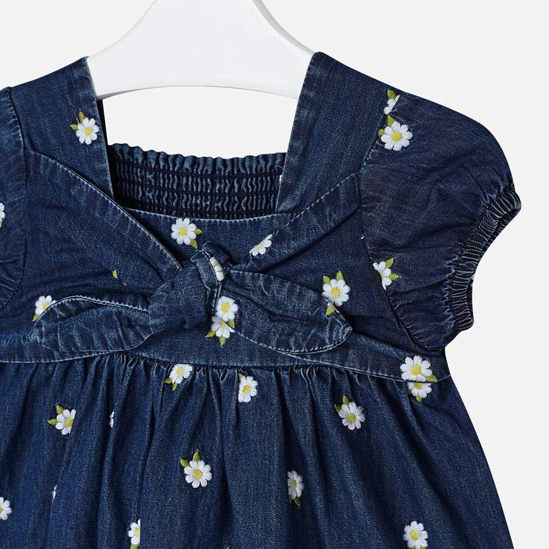 Rifľové šaty Mayoral. Šaty s krátkym rukávom s kvetmi. Cez stred šiat je mašľa. Šaty využiteľné na každý deň. Bavlnené. Jemná rifľovina. Veľmi pohodlné na nosenie.