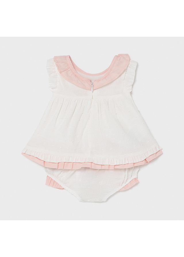 Sleeveless Dress for newborn girl. Round neckline with ruffles. Fitted to the chest. Opening on the back with an invisible zip. Inner lining in a contrasting colour. Design with a decorative ruffle at the bottom of the item.