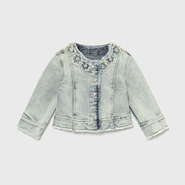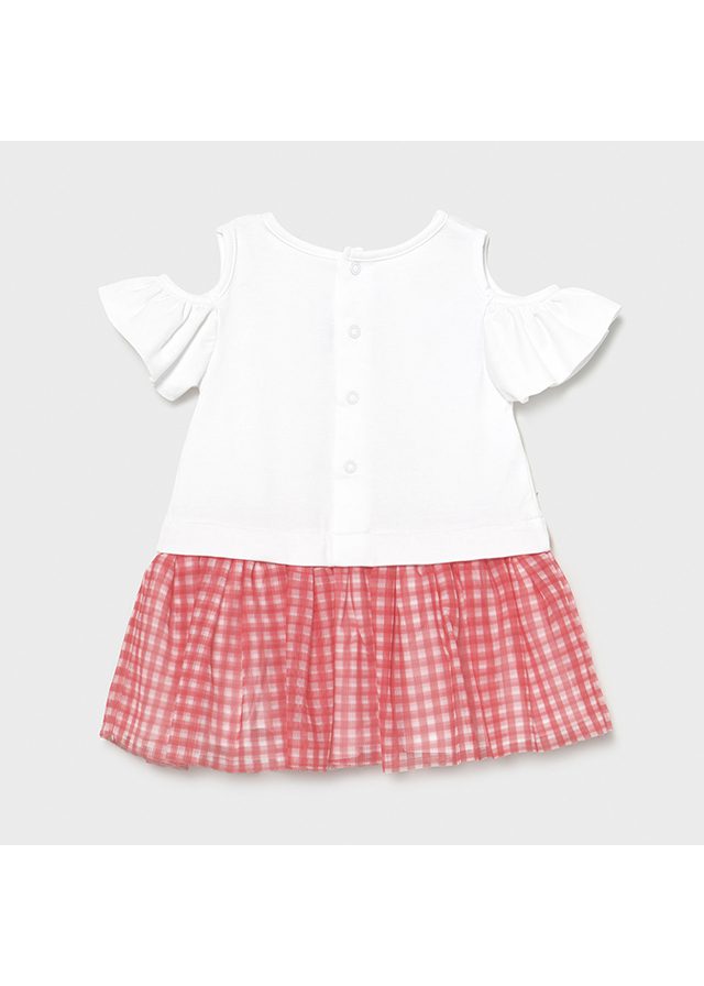 Short sleeved Dress with openings on the shoulders for baby girl. Round neckline. Snap-button fastening on the back to allow the garment to be put on easily. Made with body and skirt in different fabrics to achieve a unique and special design. Includes an inner lining. Ruffled design. Decorative elements: design on the front.