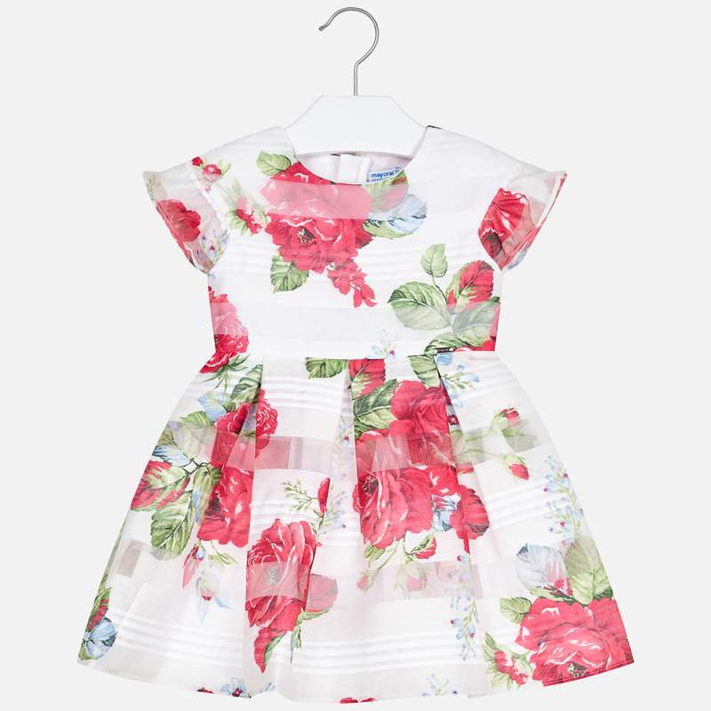 Short sleeved Dress with ruffled detailing for girl. Round neckline. Opening on the back with an invisible zip. Flowing chiffon fabric. Floral pattern.