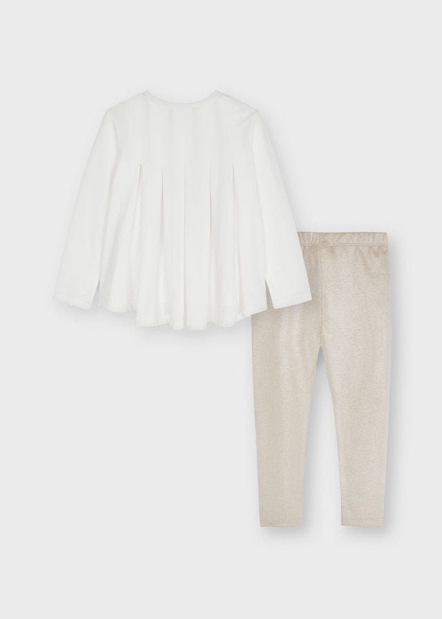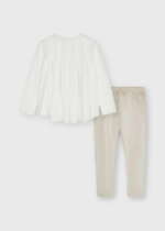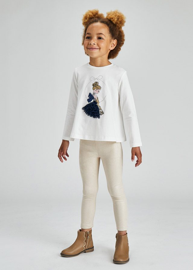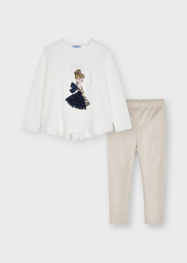 Semišové krémové legíny s tričkom s dlhým rukávom pre dievčatá značky Mayoral. Detský legínový komplet vyrobený z ľahkého materiálu, ktorý je kvalitne spracovaný. Perfektný kompet pozostávajúci zo semišových legín a trička s postavičkou. Postavička má 3D modrú sukňu.