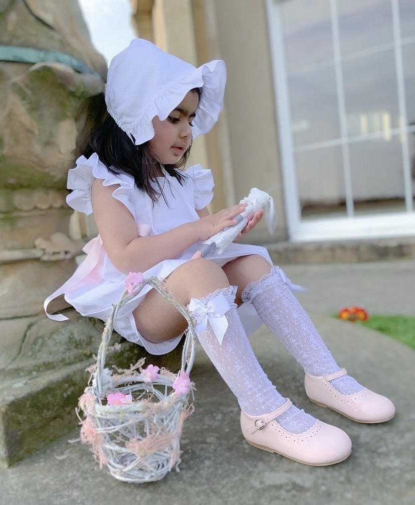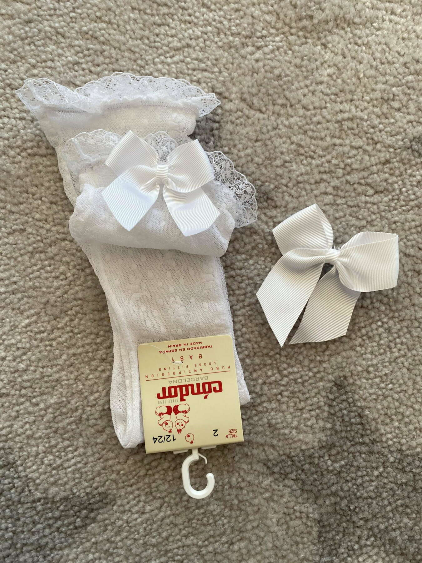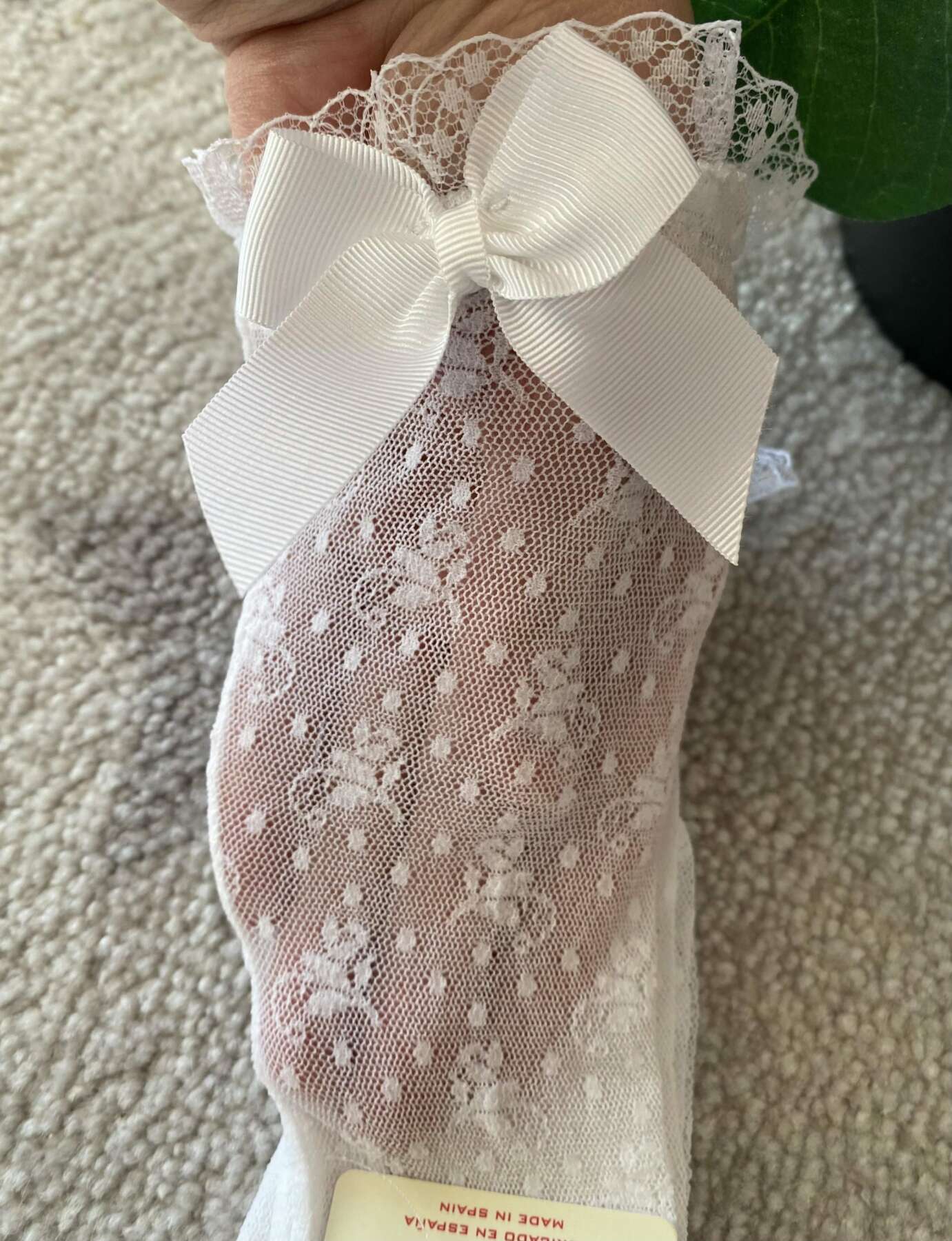 Sieťované podkolienky s bodkami, kvetmi a volánom Cóndor biele s mašľou