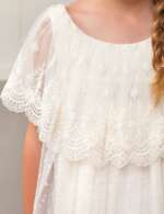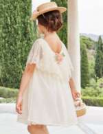 Sviatočné vyšívané šaty s 3D kvetom na chrbáte a padavým efektom na ramenách. Spodnička bavlnená. Je to voľný strih šiat. Farba je krémová. Materiál: 100% bavlna, zvonka: 50% polyamid, 45% bavlna, 5% polyester.