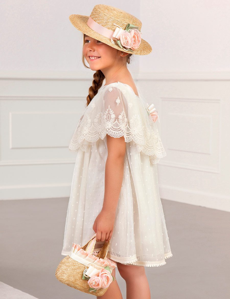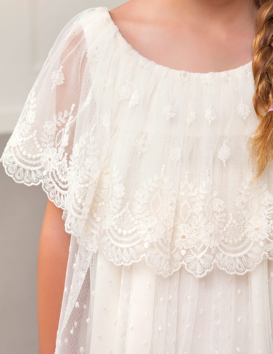 Spoločenské vyšívané šaty pre dievčatá značky Mayoral. Krásne s padavým efektom na ramenách.