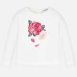 Dievčenské tričko s kvetom Mayoral. U krku je riasenie. Zloženie: 95% bavlna, 5% elastan. Skombinujte s mašličkou farby bugambilia značky Cóndor.