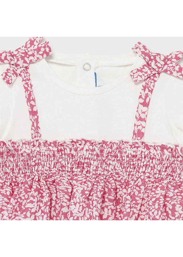 Short sleeved Blouse for baby girl. Round neckline. Snap-button fastening on the back to allow the garment to be put on easily. Made from soft elasticated cotton fabric. Decorative elements: puckered details with smocking stitching, applique bows. Floral pattern.