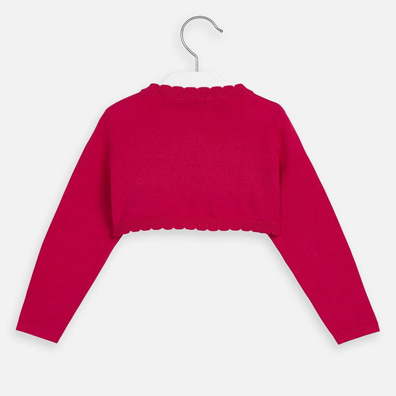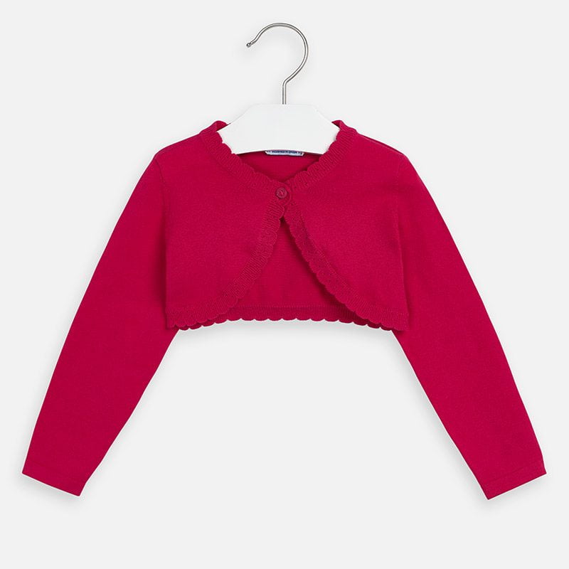 Long sleeved cardigan with same colour detailing for girl. Round neckline. Bolero style. Single button fastening on the front neckline. Made from knitted fabric. Seams finished up with wave design.