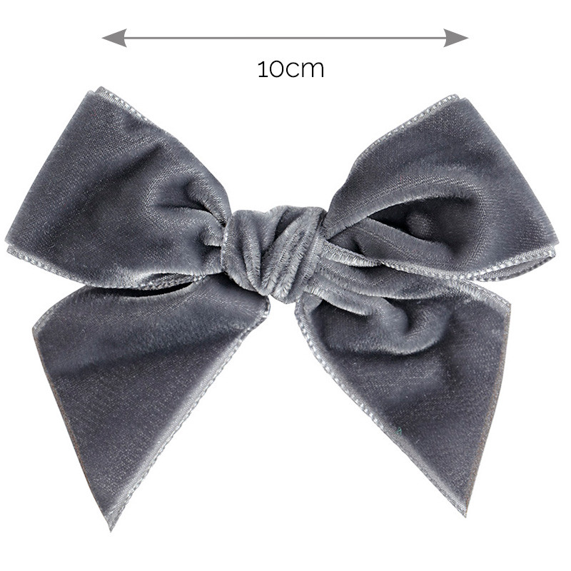 Veľká zamatová mašľa do vlasov na klip v odtieni sivej. Šírka mašle je 10 cm. Vhodná od 3 rokov. Materiál: 100% polyester.