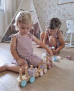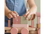 The beautiful Little Dutch wooden train has been decorated with fun patterns and numbers. Build new wagons with these blocks in various shapes and fresh, modern colours. The train consists of 17 parts and is approx. 45 cm long. This toy is always fun to play with and is also a nice accessory for the nursery or child’s bedroom.