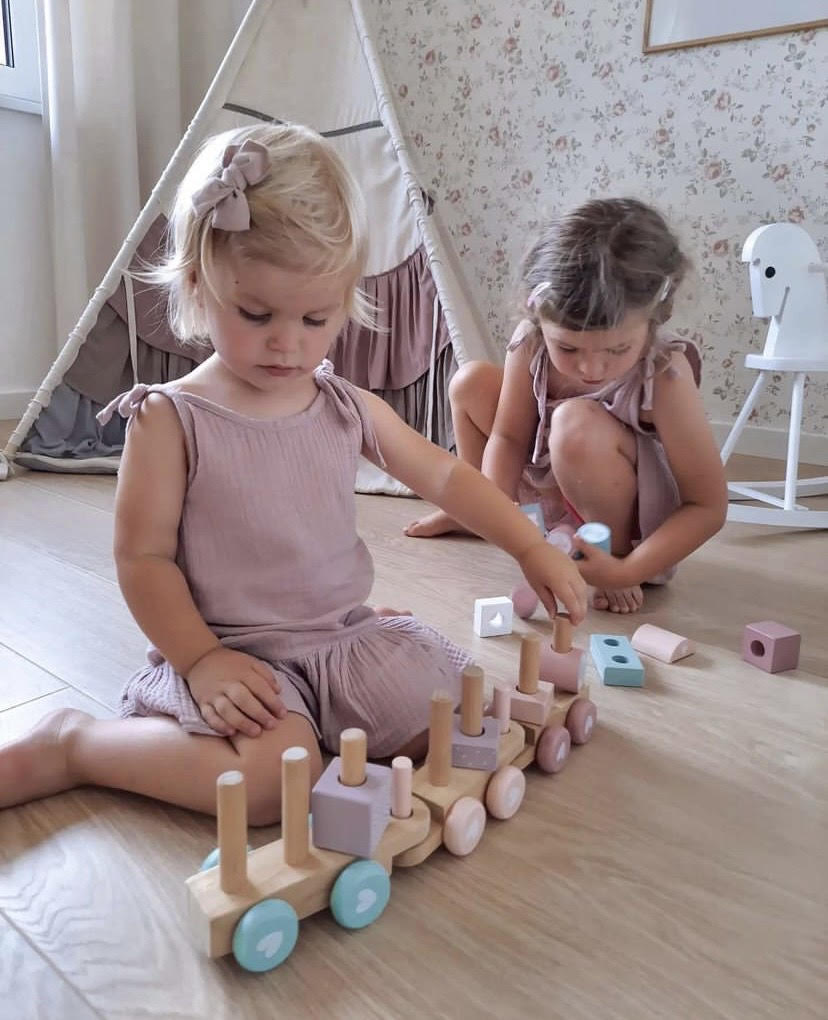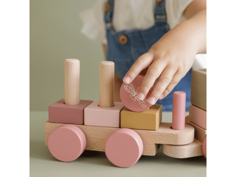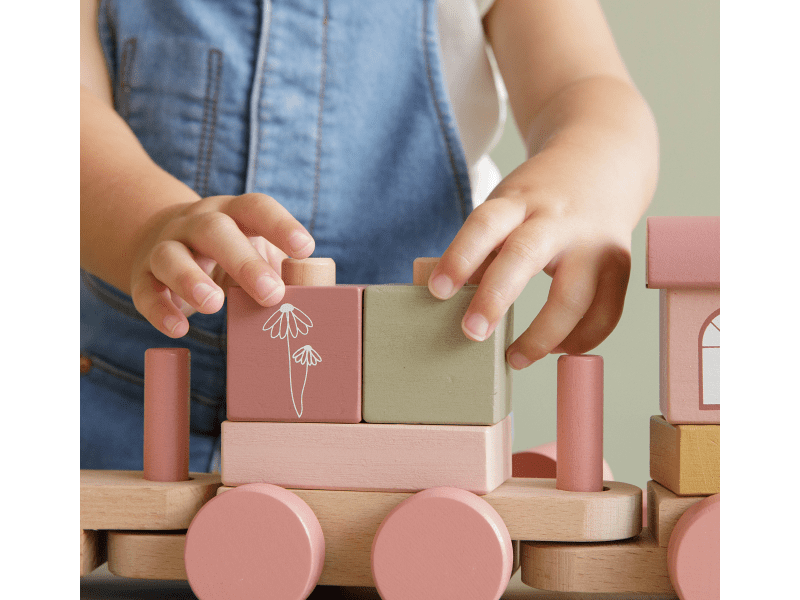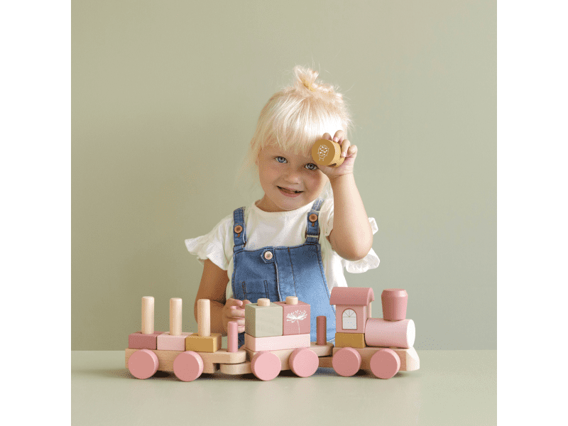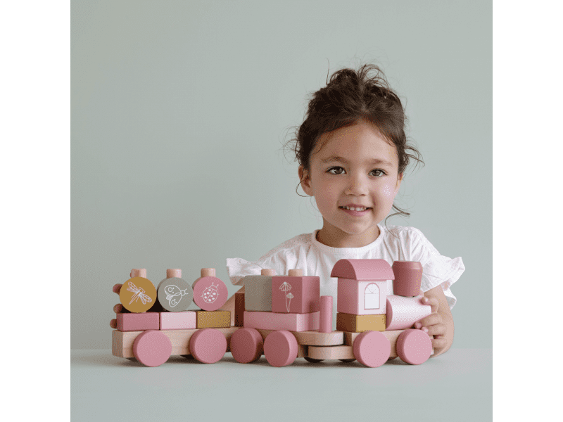 Drevený vláčik v krásnej pastelovej ružovej farbe Little Dutch. Je vyrobený z masívu s krásnym tlačeným dizajnom. Obsahuje rôzne tvary a farby kociek, ktoré zdokonaľujú motoriku, kreativitu a vzdelávanie dieťaťa. Obsahuje 17 dielov a je 45cm dlhý. Tento drevený vláčik je ideálny aj ako darček, ktorý sa stane pekným doplnkom detskej izbičky.
