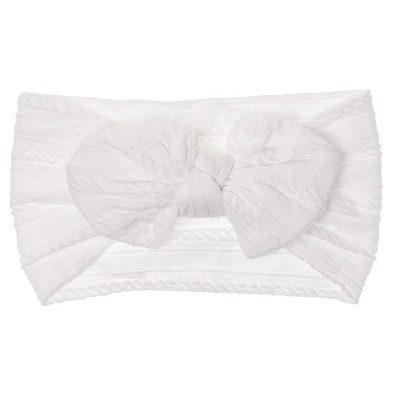 Biela textúrovaná čelenka s mašľou uzlom pre bábätká.