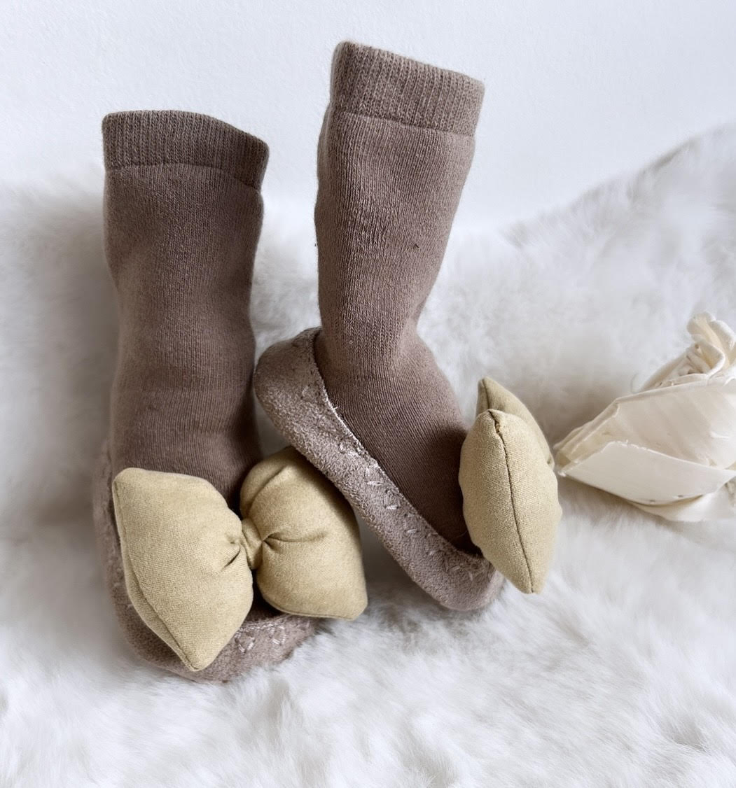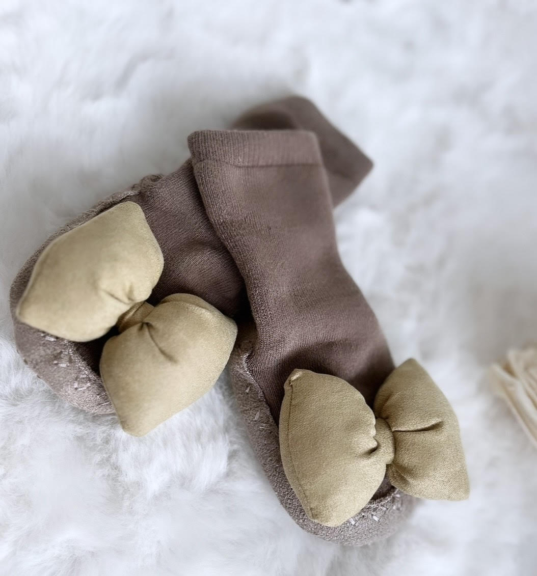 Protišmykové dievčenské ponožky s veľkou mašľou vpredu. Hnedé zateplené ponožky ideálne na jeseň a zimu.