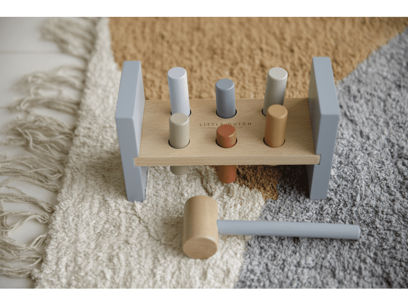 Tap tap tap! The cool Little Dutch wooden pounding bench is fun for boys and girls. Your child can hammer the pegs one by one deeper into this fun pounding bench. The 6 coloured pegs make it a very good exercise for your child’s motor skills. Did they hammer in all the pegs? Turn the bench over so they can start over again. They will be entertained for hours! Available in two colours: blue and pink.
